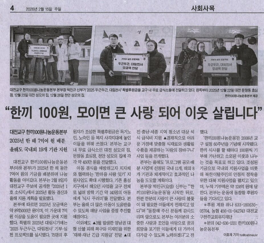 대전교구 한끼100원나눔운동본부(이하 본부)가 2025년 한 해 동안 7억여 원의 기금을 배분하며 나눔 활동을 이어갔다. 본부는 2월 8일자 대전교구 주보에 공개한 「2026년 1호 소식지」에서 2025년 활동 결산과 올해 지원 계획을 발표했다.